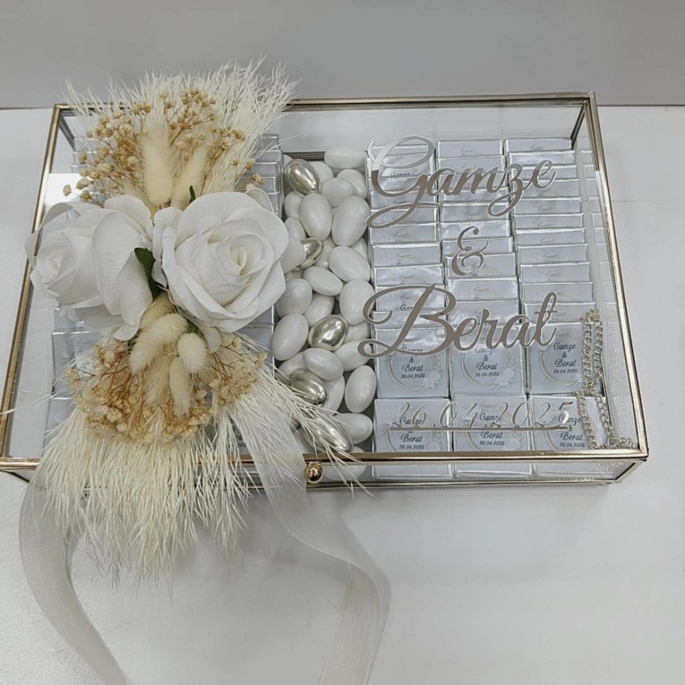 DİKDÖRTGEN CAM METAL KUTU ÇİÇEK SÜSLEMELİ KIZ İSTEME ÇİKOLATASI