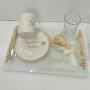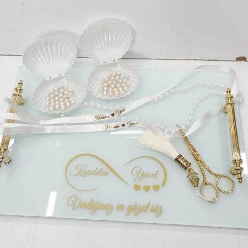 DİKDÖRTGEN CAM SÖZ NİŞAN & DAMAT TEPSİSİ TAKIMI ve İNCİLİ KURDELE