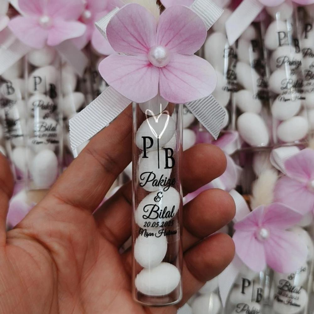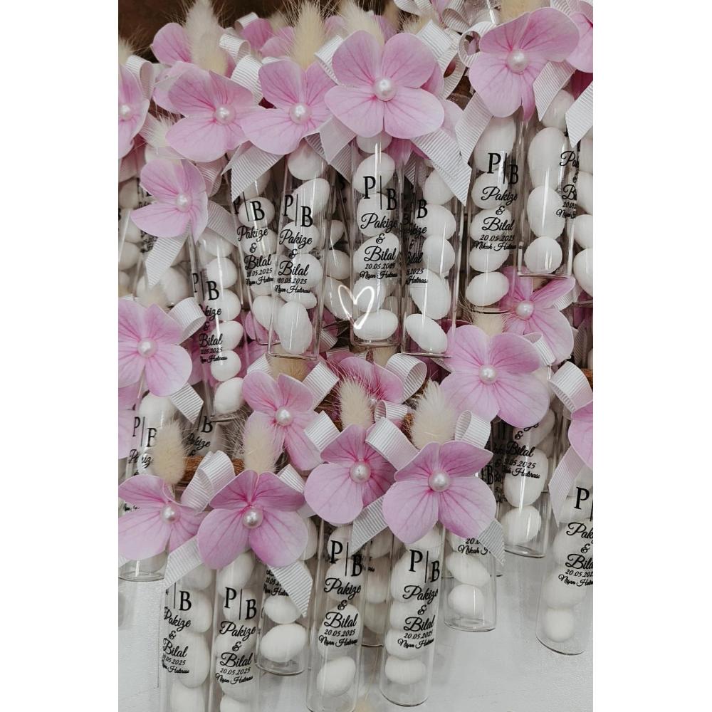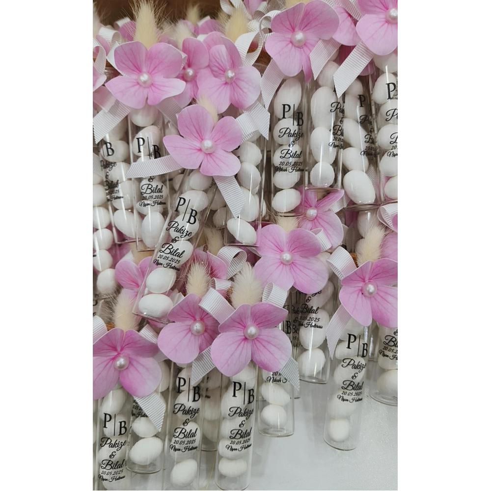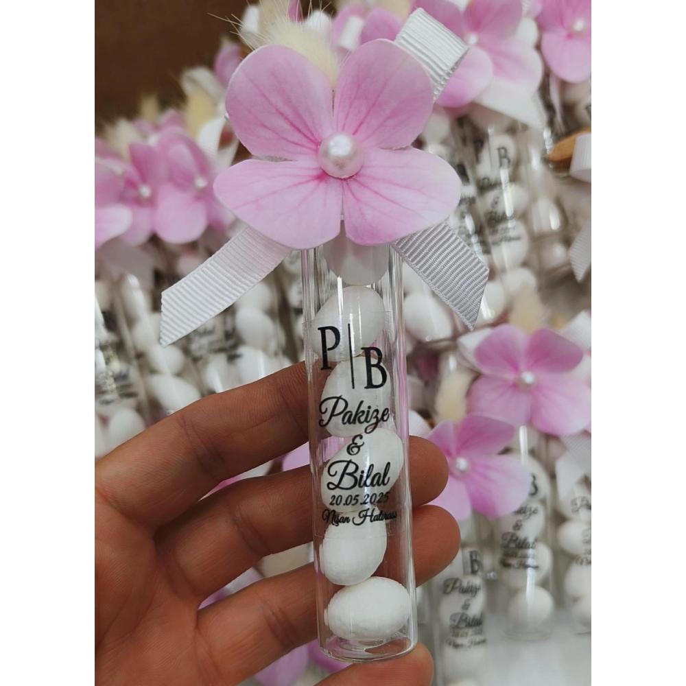 ÇİÇEK SÜSLEMELİ BADEM ŞEKERLİ MANTAR TIPALI CAM TÜP ŞİŞE